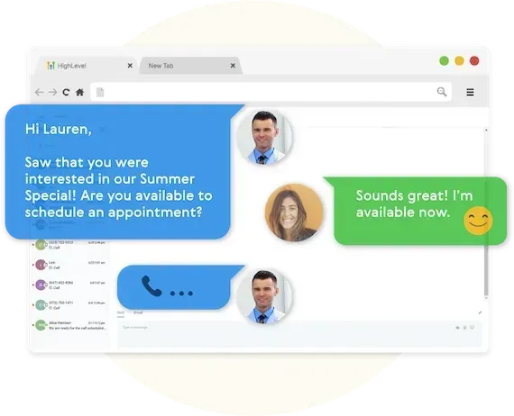 Communicate with contacts through phone, voicemail drops, SMS/MMS, email, and supported messaging platforms.
